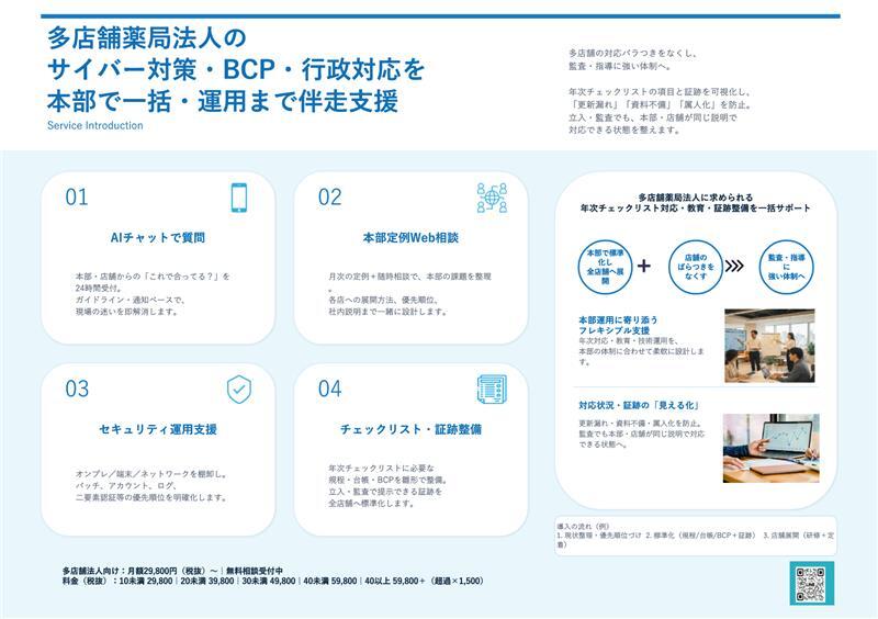 薬局法人の本部を軸に、サイバーセキュリティ・BCP・監査/行政対応に必要な